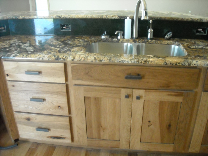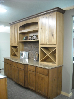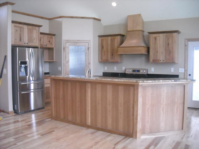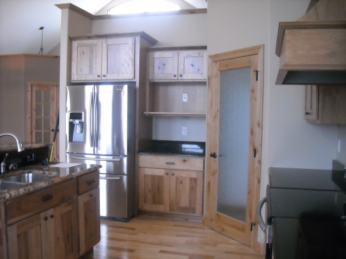 Dura Supreme. Sante Fe Door Style. Base Cabinets are Knotty Alder. Wall Cabinets are Sage on Rustic Hickory