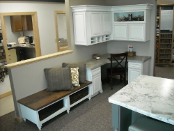 Merillat Cabinets. LaBelle with Five piece Drawer Front Door Style. Base, Wall, and Bench Cabinets are Cotton with Tuscan Glaze on Maple.